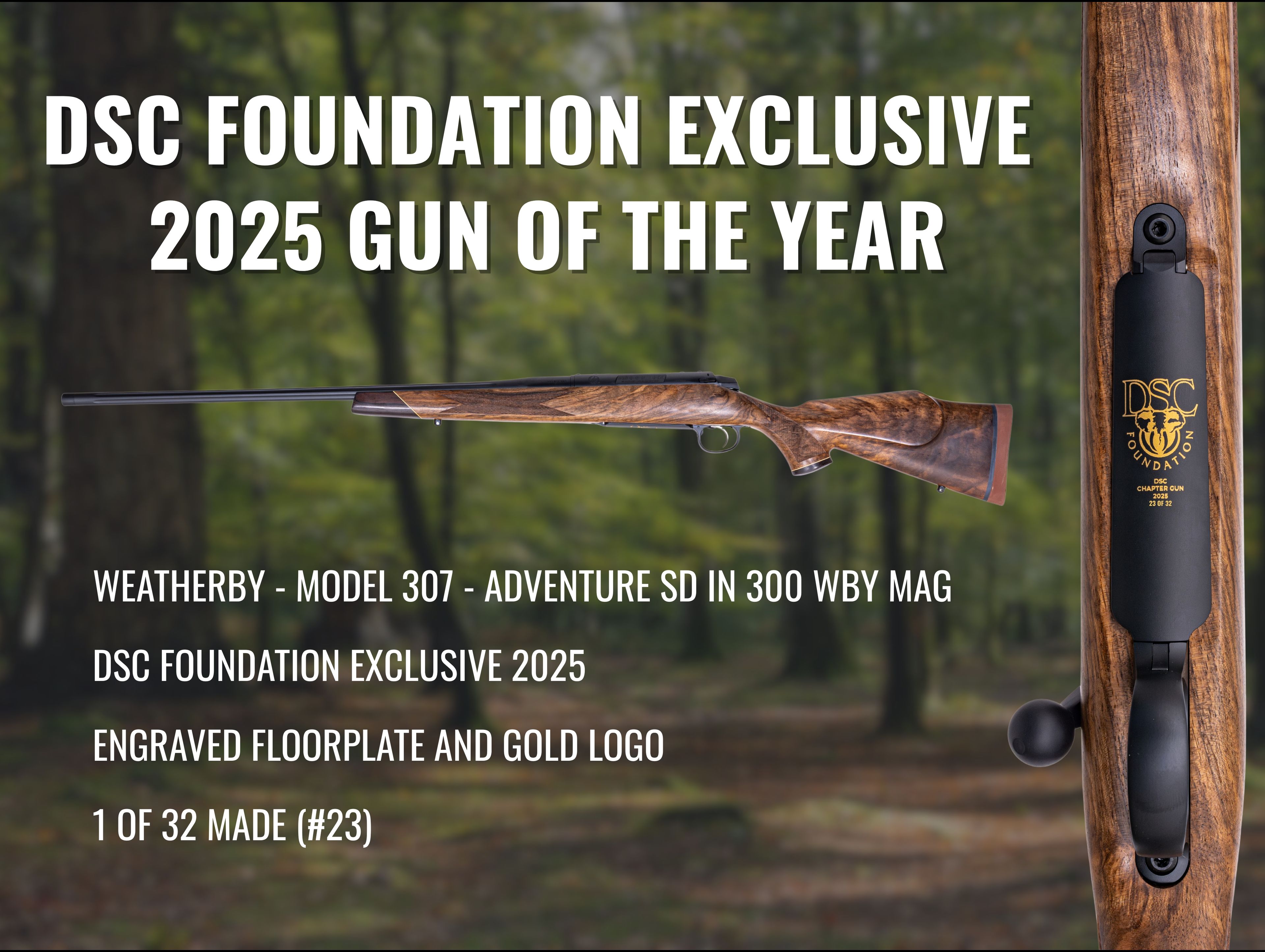 NO PURCHASE NECESSARY. Open to legal U.S. residents, 21+. Void where prohibited. Sweepstakes ends November 1, 2025 at 8:00 PM CST. One (1) winner will receive the DSC Foundation Exclusive Gun of the Year – Weatherby Model 307 Adventure SD DSC Foundation Exclusive 2025 (MSRP $3,250). Winner must pass all required federal, state, and local background checks and comply with firearms laws to take possession of the prize. Odds of winning depend on number of eligible entries received. Full rules above. Sponsor: DSC Foundation.